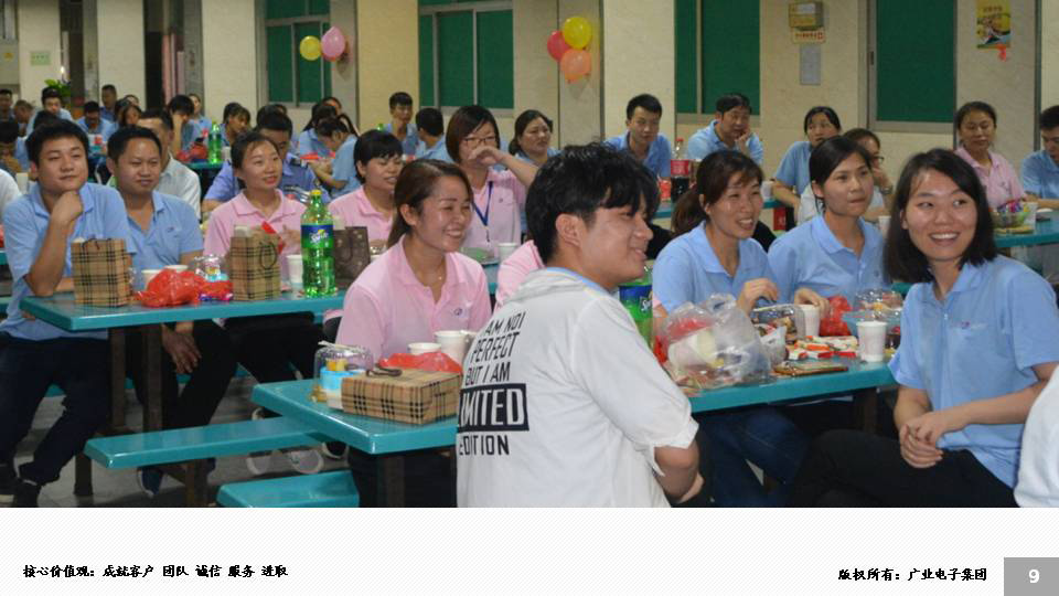 為建立團(tuán)隊(duì)正向溝通,積極向上,溫馨和諧的工作氛圍,激發(fā)員工的工作積極性和熱情;同時(shí)以邀請員工主動參與公司層面活動的方式,展示我廣業(yè)員工的活力與 風(fēng)采,增強(qiáng)團(tuán)隊(duì)的向心力和凝聚力。2018年7月10日晚,廣業(yè)電子第二季度員工生日會在公司大食堂舉行,來自各部門近200名員工參與了生日聚會,通過嘉賓送祝福語,互動游戲,壽星抽獎(jiǎng)送祝福等活動環(huán)節(jié)的展開,在員工的積極參與下 ,整體活動順利開展,留下陣陣歡聲笑語。